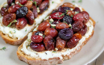 Toasted Bread with Roasted Grapes and Herb Garnish