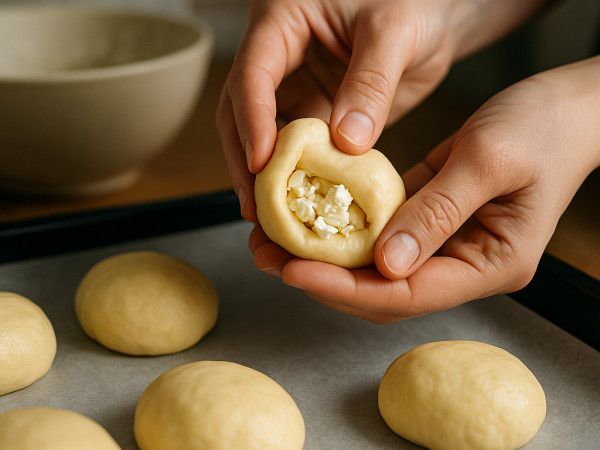 While the dough is rising, mix the feta cheese, parsley, salt, pepper, and chili powder in a bowl until well combined. Once the dough has risen, give it a quick knead for a couple of minutes. Divide it into 12 even pieces and roll each piece into a ball. Flatten each ball into a circle about 2 to 3 inches wide, either with your hands or a rolling pin. Spoon some of the cheese filling into the center of each circle, then gather the edges up and pinch them together to seal, creating little bundles. Place these bundles seam-side down on a buttered baking tray. Brush the tops with milk and sprinkle some poppy seeds over them.