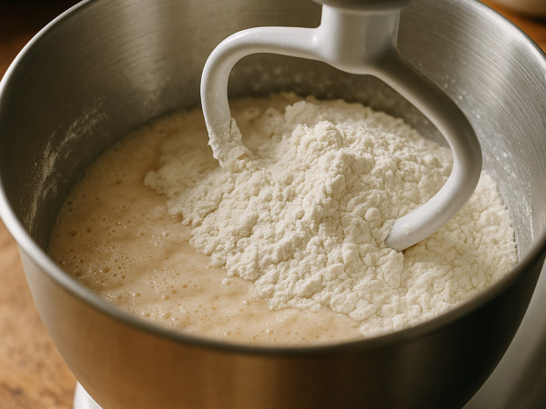 Stir the yeast and sugar into warm milk in a bowl. Let it sit for about 5 minutes until the yeast gets soft and foamy. In a stand mixer bowl, combine 1 cup of all-purpose flour, the whole wheat flour, half a cup of water, vegetable oil, salt, and the yeast mixture. Using the dough hook, knead everything together until the dough feels soft and a bit stretchy but not sticky. If itβs too sticky, sprinkle in a little more flour; if itβs too stiff, add a splash of warm water. Cover the bowl with a damp cloth and let the dough rest at room temperature for about 45 to 50 minutes until it puffs up.