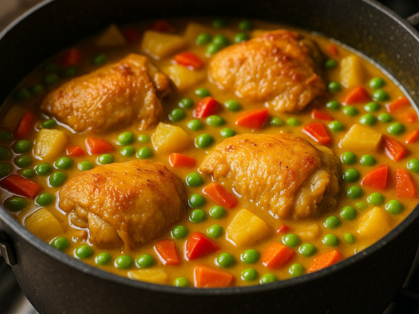 Toss in the chicken thighs along with the peas, peppers, and carrots. Turn the heat up to medium-high and bring everything to a gentle boil. Once it’s bubbling, lower the heat and let it simmer gently for around 25 minutes, until the chicken is cooked through.