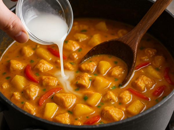 While the curry is simmering, mix a tablespoon of cornstarch with a couple of tablespoons of cold chicken stock to make a smooth slurry. Stir this into the curry to help thicken the sauce. Finally, add the pineapple chunks and let everything cook together for about 5 minutes until the sauce has thickened nicely and all the flavors have melded.