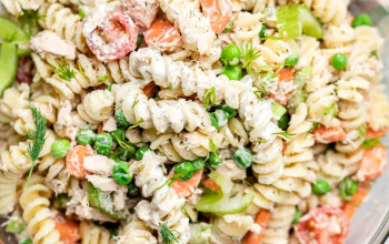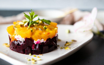 Sweet Potato and Beet Noodle Salad with Goat Cheese Medallions and Pistachio Dressing