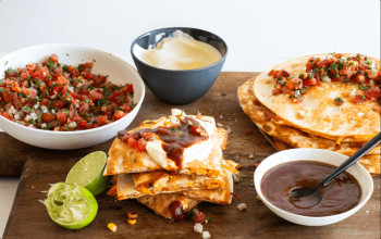Cherry Wood-Smoked Chicken Quesadillas Accompanied by Fresh Pico de Gallo