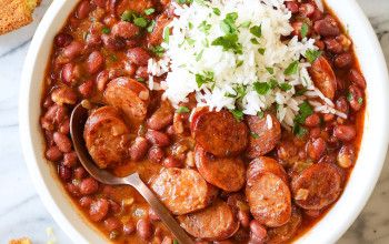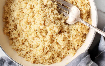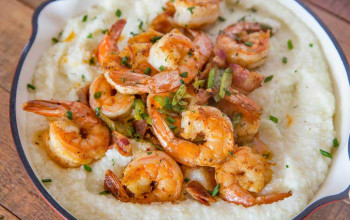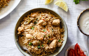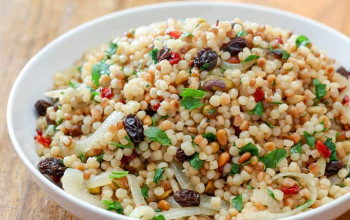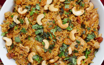 Herbed Cauliflower Rice Topped with Pecans and Sweet Bacon-Wrapped Chicken