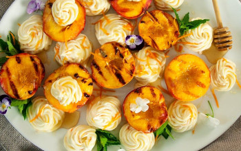 Toast topped with Grilled Peaches, Creamy Mascarpone, and Honey