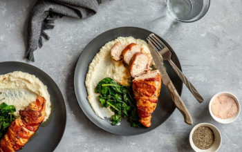 Herbed Cauliflower Rice Topped with Pecans and Sweet Bacon-Wrapped Chicken