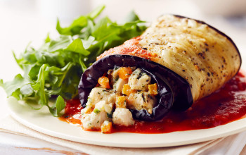 Eggplant Roll-Ups Accompanied by Bell Pepper Sauce